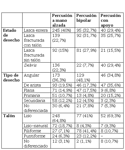 En cuanto a los tipos de desechos, en el caso de las tres técnicas de talla prevalecen las lascas angulares. Además de estas, hay porcentajes importantes de lascas de arista y planas en el caso de la talla a mano alzada y bipolar. Mientras que en la talla con apoyo hay relevancia de lascas primarias, lo que se sustenta en la utilización de esta técnica para las primeras etapas de reducción.