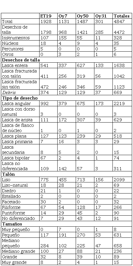 Hemos registrado algunas características específicas relevantes para evaluar la presencia de actividades de talla en los sitios arqueológicos: la presencia de altos porcentajes de fragmentación (62%) y de gran cantidad de desechos indiferenciados o debris (30%) (Moreno, 2015; Moreno y Egea, 2020; Egea y Moreno, 2021). Pero además, se observan características generales, como altos porcentajes de desechos de talla, frente a los instrumentos (Tabla 1). En torno a los desechos de talla, se observa un predominio de lascas angulares y talones lisos, aunque hay porcentajes significativos de talones filiformes y puntiformes y una importante variabilidad de tamaños, formas geométricas y espesores (Moreno, 2015; Moreno y Egea, 2020). Con respecto a los instrumentos, presentan mayoritariamente formatización simple, a través de retoque unifacial marginal irregular, que conforma filos tipo cortantes, muescas, raspadores y raederas principalmente. Solo se observa mayor inversión de trabajo en el caso de las puntas de proyectil, recuperadas únicamente en la cueva Oy7 (Egea y Moreno, 2021).