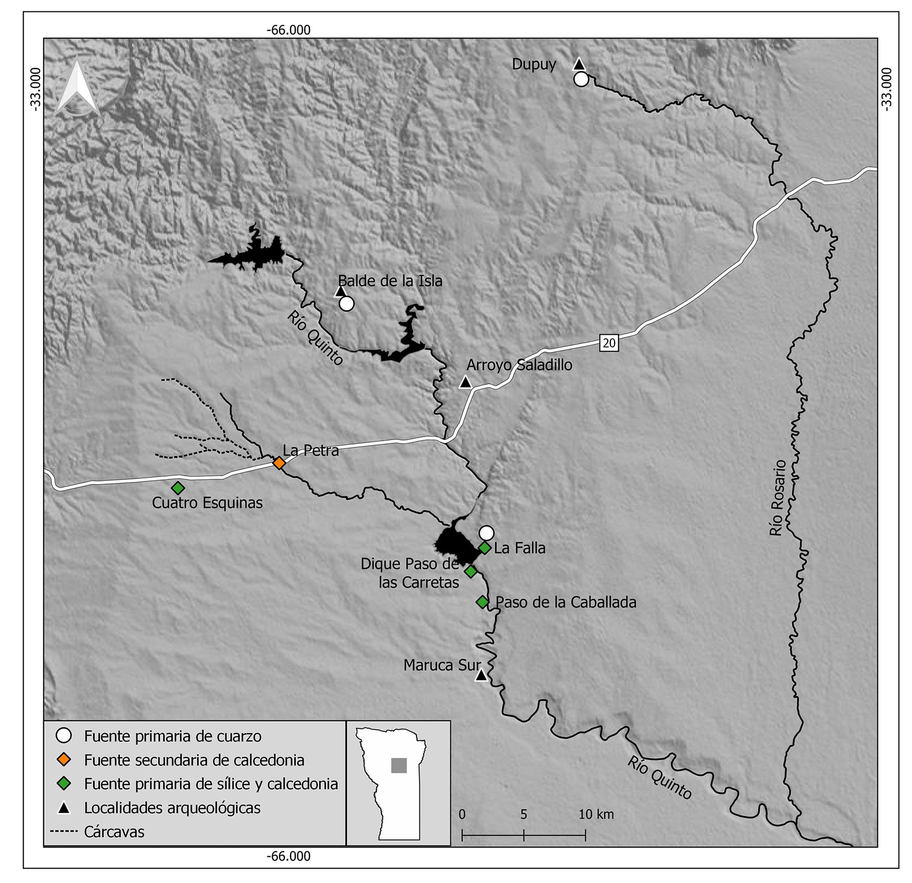 El área de estudio está constituida por la cuenca alta y media del río Quinto e incluye sectores tributarios (río Rosario, arroyos La Petra y Saladillo). Se caracteriza por la abundancia en la disponibilidad de materias primas con una distribución acotada a determinados puntos del paisaje. Los principales recursos líticos son las rocas silíceas y cuarzos disponibles en diferentes formas de presentación y asociados a los depósitos conformados en el Paleozoico y el Neógeno (Figura 1).