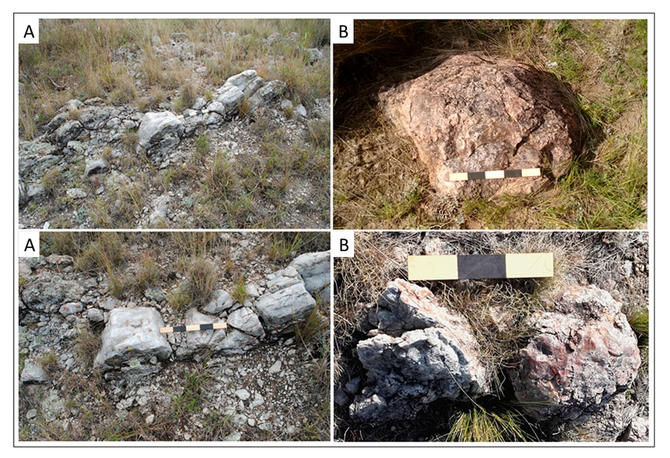Sobre el sector de serranías se reconoce un basamento cristalino constituido por migmatitas, esquistos y granitos donde se intruyen cuerpos de pegmatitas con dimensiones que van desde algunos metros a decenas de metros de potencia, en general, orientados de norte a sur. Estas últimas poseen zonas con cuarzo y calcedonia dispuestas en agregados de formas irregulares de dimensiones menores al metro que rellenan las fracturas de las pegmatitas (Figura 3). Estos afloramientos de rocas silíceas emplazados sobre pegmatitas fueron expuestos en superficie producto de la formación de la falla geológica San Martín-Saladillo-Paso de Las Carretas, que activó un proceso que generó el levantamiento y la exposición de las rocas silíceas. La falta de estudios acerca de estos procesos impide conocer con certeza su temporalidad; hasta el momento, podemos decir que estas formaciones podrían estar relacionadas con la conformación del basamento durante el Paleozoico (A. Ortiz Suárez comunicación personal, 2020).