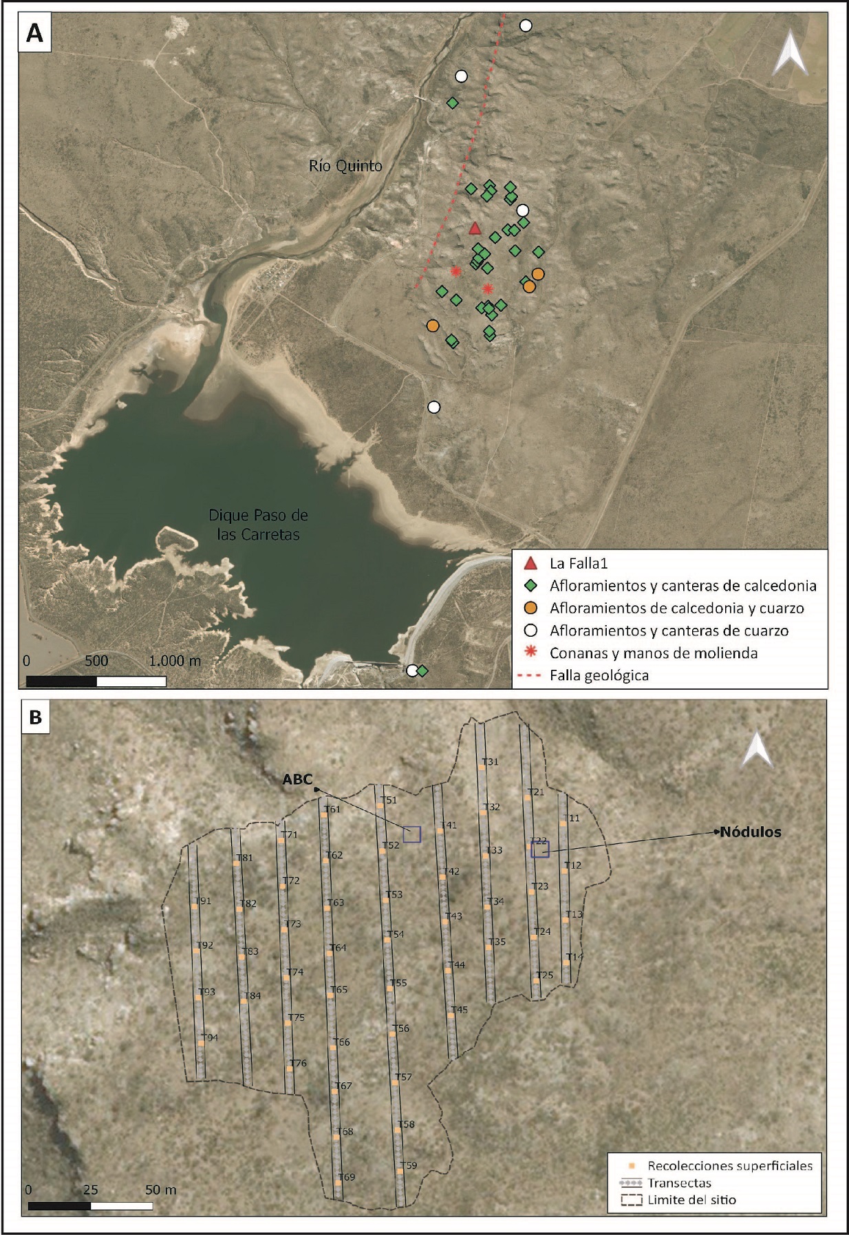 La Falla 1 abarca un área aproximada de 300 m., definida a partir de un primer acercamiento, en que se recorrió de forma radial el sector aledaño al punto GPS y se tomaron los sectores con abundancia o ausencia de material lítico en superficie de manera de definir los límites del sitio. Con posterioridad, se ejecutaron nueve transectas a intervalos de 20 m y se realizaron recolecciones superficiales en cuadrantes de 1 m. de manera de abarcar de forma representativa el área que ocupa la cantera. Por su parte, dentro de La Falla 1 se identificaron dos sectores puntuales con altas densidades de material y características particulares que resultaron de interés. Estos fueron denominados ABC y Nódulos; en ellos, se llevaron a cabo recolecciones adicionales (Borgo, 2020; Borgo et al., 2020).