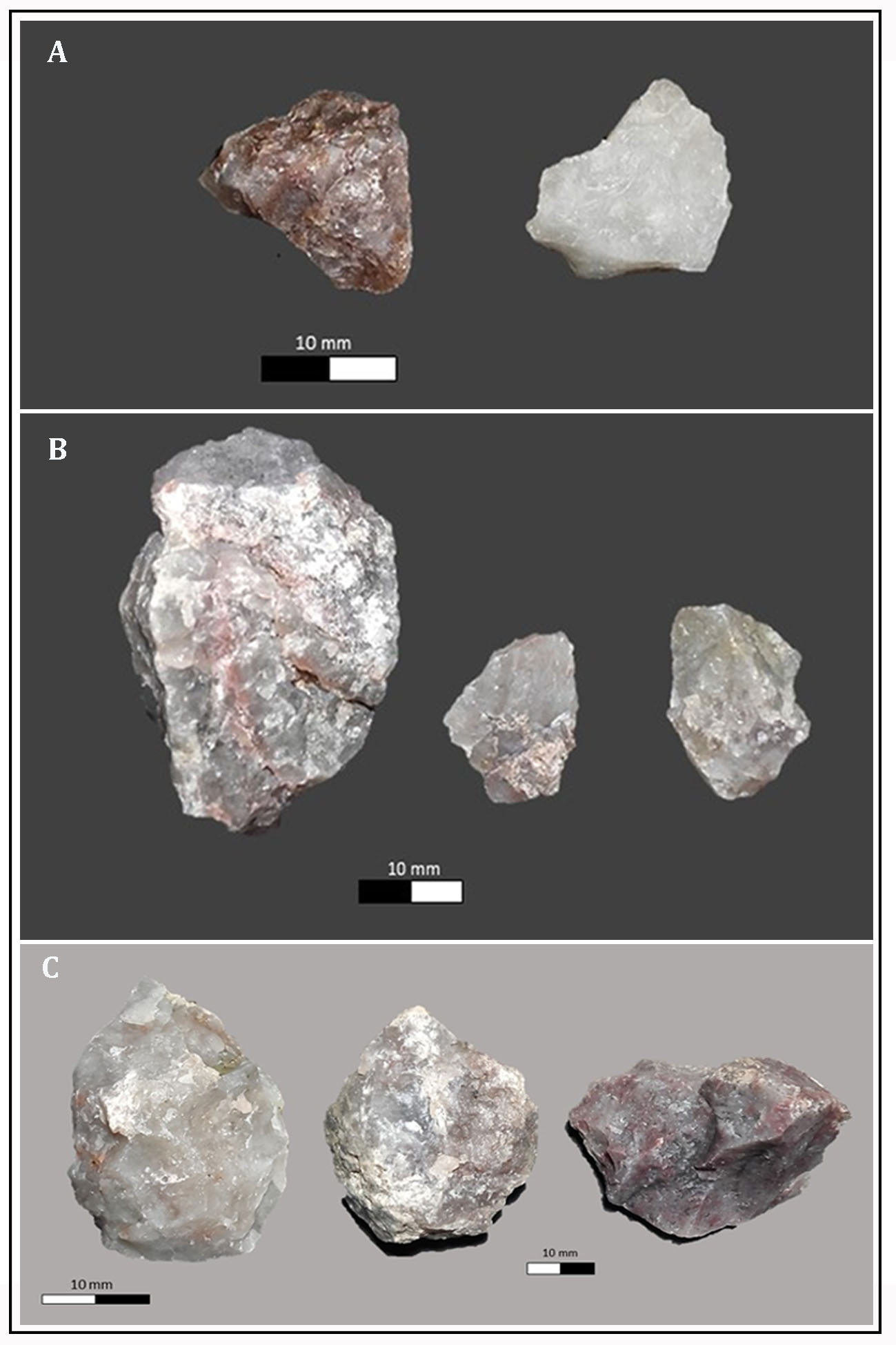 En el río Quinto, se identificaron una variedad de calcedonias y otras rocas silíceas aptas para la talla tanto en fuentes potenciales como en canteras-taller. Se destaca la diversidad de formas de presentación, que van desde grandes bloques y clastos irregulares o tabulares a pequeñas vetas de poca potencia. De igual modo que el cuarzo, se emplazan en sectores acotados del espacio, aunque son mucho más extensas las ubicadas sobre la cuenca media. Por otra parte, dentro de los contextos arqueológicos relevados se identifica la presencia de calcedonias de disponibilidad local (aquellas que se encuentran a una distancia que no supera los 40 km) provenientes del área de canteras La Falla y otra variedad similar a las disponibles en la fuente potencial Paso de la Caballada (Figura 1). Además, se registran otras variedades que ingresaron en estados avanzados de formatización, y en general, se relacionan con la confección de instrumentos especializados, pero aún desconocemos su origen (Borgo et al., 2019; Borgo, 2020).