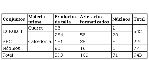 Los artefactos analizados (n = 643) provienen de La Falla 1 (n = 342), ABC (n = 224) y Nódulos (n = 77) (Tabla 1). En general, se encuentran compuestos por dos materias primas principales: calcedonia (95%; n = 613) y cuarzo (5%; n = 30), este último, presente solo en los materiales de La Falla 1. En cuanto a las clases artefactuales, son más frecuentes los productos de talla (n = 503), seguidos por los artefactos formatizados (n = 109) y núcleos (n = 31), representados de igual forma en los tres conjuntos (Figura 5).