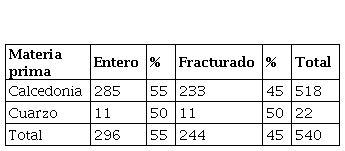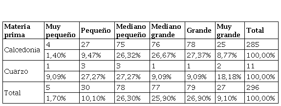El 45% (n = 244) de los artefactos que componen la muestra se encuentran fracturados. La calcedonia presenta un mayor número de piezas enteras, y el cuarzo, iguales valores en ambas categorías (Tabla 2). Los tamaños se concentran en los medianos (n = 155) y grandes (n = 106); en menor número se registran pequeños (n = 35). De acuerdo con las materias primas, las calcedonias tienen mayores porcentajes en los tamaños medianos y grandes, mientras que el cuarzo registra mayor número de elementos pequeños y mediano-pequeños, seguidos por los muy grandes (Tabla 3); lo que indica un predominio de las etapas iniciales e intermedias dentro de la cantera y principalmente vinculadas con la explotación de la calcedonia.