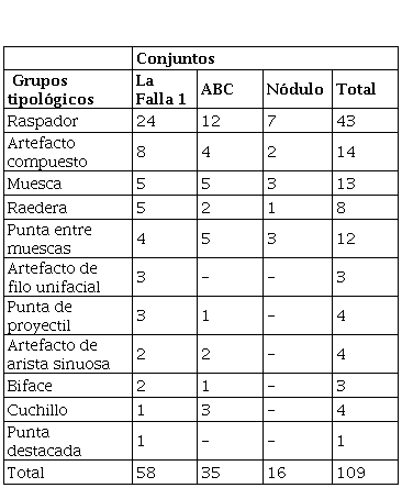 Los instrumentos fueron confeccionados únicamente sobre calcedonia (n = 109), y recuperados principalmente en las recolecciones realizadas en La Falla 1 (53%; n = 58); mientras que el 32% (n = 35) se registran en el sector ABC y el 15% (n = 16) en Nódulos. En los tres conjuntos se observa la presencia de instrumentos diversos como raspadores (n = 43), artefactos compuestos (n = 14), muescas (n = 13), puntas entre muescas (n = 12), raederas (n = 8) y puntas de proyectil (n = 4). Además, se destaca la presencia de bifaces (n = 3) (Tabla 4). Los soportes utilizados son principalmente lascas internas (n = 52) y externas (n = 16); aunque también se identificaron raspadores (n = 3), un artefacto compuesto y un filo bifacial confeccionados sobre nódulos (n = 3), un hemiguijarro y un núcleo bipolar (presentes en La Falla 1) (Tabla 5).