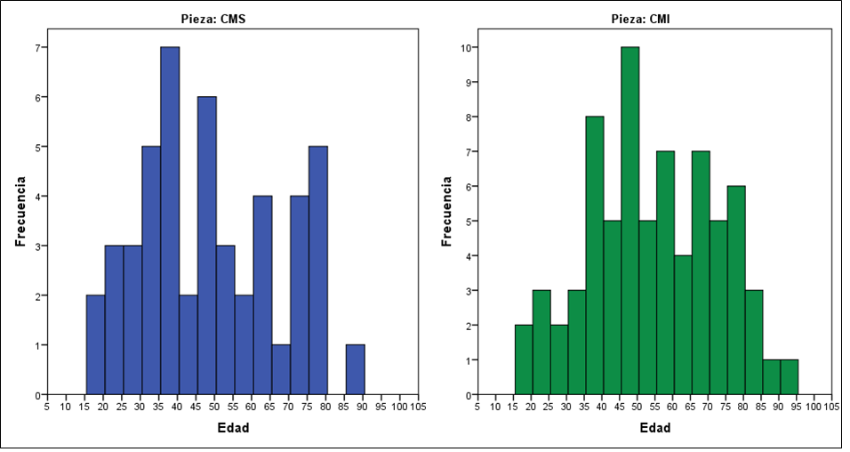 Se seleccionaron 51 caninos superiores (CMS) y 73 caninos inferiores (CMI) pertenecientes a 84 individuos adultos (32 femeninos y 52 masculinos) provenientes de la colección Lambre (Facultad de Ciencias Médicas-Universidad Nacional de La Plata [FCM-UNLP]) con edades comprendidas entre los 18 y los 91 años (Media = 52,17; Mediana = 50) (Figura 1). Todos los individuos presentan información documental asociada (edad, sexo, fecha y causa de muerte, entre otras) provenientes de las actas del Cementerio Municipal de la ciudad de La Plata (Salceda et al., 2012).