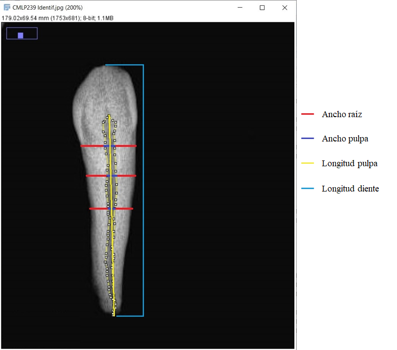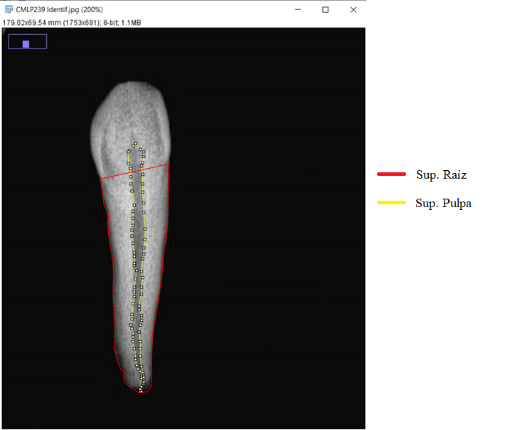 Para el relevamiento radiográfico se posicionaron los caninos sobre el plano mesiodistal de una placa de cera dental roja. Las radiografías dentales fueron obtenidas en el Hospital Interzonal General de Agudos “Profesor Dr. Rodolfo Rossi” utilizando un tubo de rayos X columna Dinan Digitalizadora AGFA CR30XM (42Kv y 6,4 Mamp). Posteriormente, se transformó el archivo DICOM en uno con formato JPG para su procesamiento.