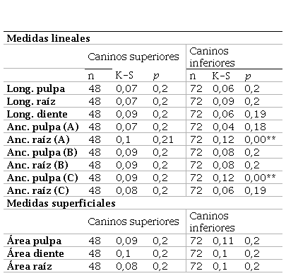 En el caso de los cocientes lineales, los resultados fueron los siguientes: en relación con el cociente longitud de pulpa/longitud de diente (FL), las diferencias no fueron estadísticamente significativas (t=-0,39; p=0,69); el cociente ancho de la pulpa/ancho raíz a nivel de la unión cemento esmalte (FWCE) tampoco fue significativo (t=0,96; p=0,35). Por último, el cociente a nivel medio de la raíz (FWMR) y aquel intermedio entre FWCE y FWMR (FWM) tampoco ofrecieron diferencias estadísticamente significativas según el sexo (FWM: t=-0,55; p=0,58; FWMR: t=-0,12; p=0,9). En ningún caso se encontraron diferencias estadísticamente significativas. Por otro lado, respecto de los cocientes superficiales, los resultados de las comparaciones estadísticas fueron los siguientes: tanto para el cociente APD (t=0,43; p=0,66) como para el cociente APR (t=1,02; p=0,3), las diferencias no fueron estadísticamente significativas.