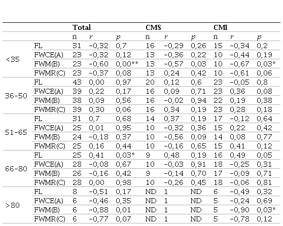Al dividir el análisis por grupos de edad, se observa que, para la muestra total, solo los cocientes FWM en menores de 35 años y en mayores de 80, y el FL en individuos de 66 a 80 años se correlacionaron significativamente con la edad. Por el contrario, al segmentar la muestra en caninos superiores e inferiores y grupo de edad, solo el cociente FWM en menores de 35 años mantuvo esa correlatividad en ambos tipos de caninos (Tabla 5).