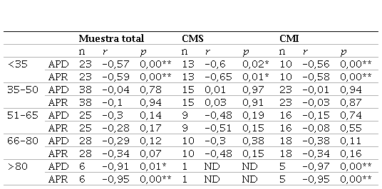 Por último, el análisis por grupo de edad refleja (al igual que en los cocientes lineales) que en individuos menores a 35 años, los cocientes lineales en su totalidad presentan una correlación significativa (media) con la edad cronológica. Si bien en individuos mayores de 80 años los resultados también fueron estadísticamente significativos, el bajo número muestral obliga a interpretarlos de manera cautelosa.