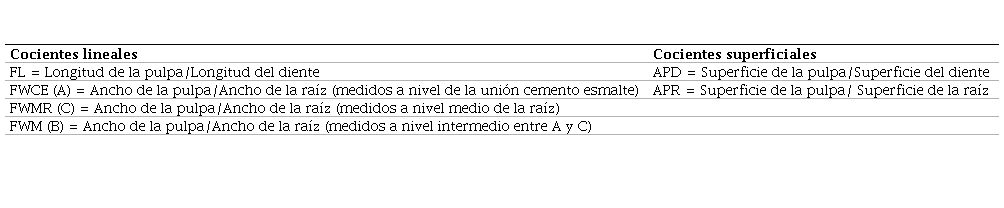 Una vez obtenidas las medidas, se realizaron los cálculos de los cocientes propuestos por Kvaal y Solheim (1994) y Cameriere et al. (2004). Por otro lado, se desarrolló uno nuevo a partir de medidas superficiales de raíz y diente, denominado APR. La importancia de este nuevo cociente propuesto radica en la posibilidad de minimizar el impacto del desgaste dental. Todos los cocientes utilizados en el presente estudio se exponen en la Tabla 1. (Error 1: La referencia: Tabla 1 está ligada a un elemento que ya no existe)