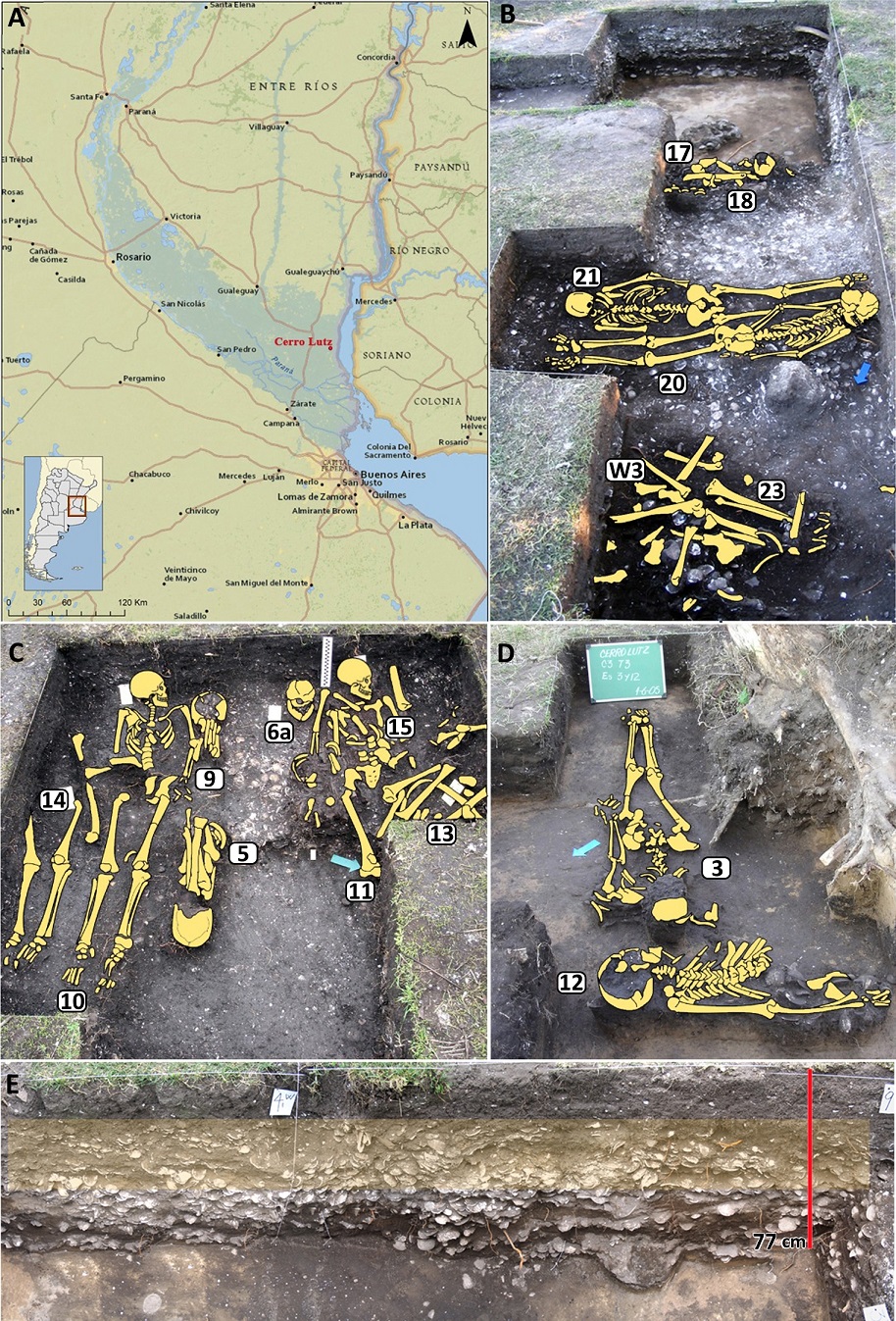 Cerro Lutz se ubica sobre un albardón fluvial edafizado en el departamento de Gualeguaychú (provincia de Entre Ríos, Argentina; Figura 1a), y fue utilizado como cementerio entre los 1100 y 730 años AP (Acosta et al., 2010; Mazza, 2010). Se recuperaron aproximadamente 40 individuos (análisis en curso) provenientes de cuatro unidades de excavación con una superficie total de 15,85 m., aunque se estima que la ocupación arqueológica se extiende por 24.000 m.. La mayoría de los entierros se hallaban a una profundidad de entre 15-30 cm entre capas de valvas de moluscos fluviales Diplodon (Rhipidodonta. variabilis (Figuras 1b y 1c), que forman parte de un conchero de origen antrópico (Loponte et al., 2019). En otros entierros, la densidad de valvas era menor y con especímenes más fragmentados (Figura 1d). Por otra parte, los entierros estaban mezclados, en menor medida, con restos faunísticos, fragmentos de cerámica lisa y artefactos óseos y líticos (Acosta et al., 2010). A su vez, estaban rodeados de pequeñas y medianas raíces, y algunos de ellos, con señales de haber sido perturbados por la acción del arado en tiempos modernos.