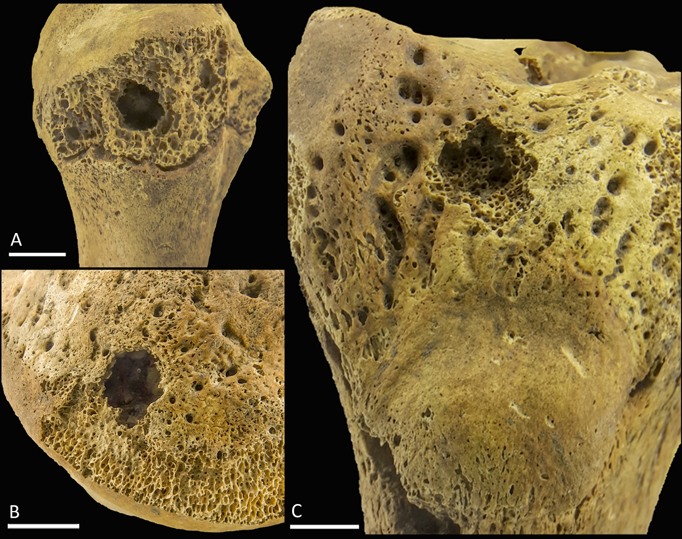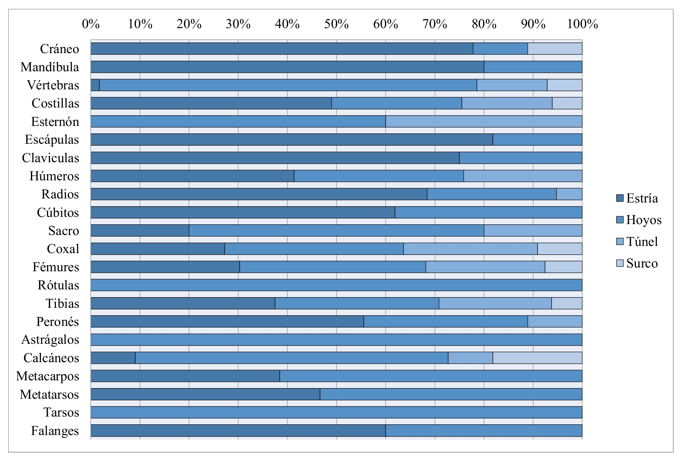 El 98,8% (MNE = 264) de los elementos óseos con modificaciones producidas por insectos presentan varios tipos de marcas en el mismo hueso. Estas corresponden a hoyos (66,7%; MNE = 178), estrías con forma de cuña (57,7%; MNE = 154), túneles (22,5%; MNE = 60) y surcos (6,7%; MNE = 18) (Figuras 2, 3 y 4). Los hoyos y túneles tienen forma ovoide, se presentan aislados o agrupados, especialmente en las epífisis de los huesos largos. Se midieron 283 hoyos, que presentan una longitud promedio de 5,94 mm, ds = 1,52 mm (mín. = 2,88 mm; máx. = 12,58 mm) y un ancho promedio de 4,51 mm, ds = 1,16 mm (mín. = 2,35 mm; máx. = 8,13 mm).