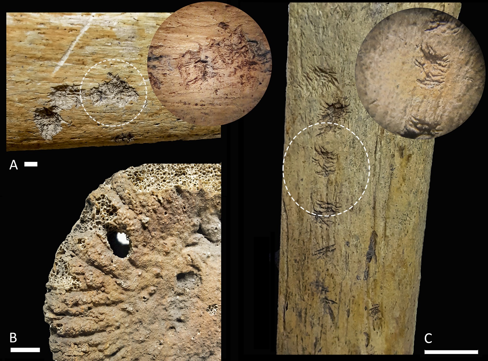 Las investigaciones arqueológicas se han centrado en modificaciones óseas producidas por insectos pertenecientes a los órdenes Isoptera (termitas), Hymenoptera (abejas, avispas y hormigas), Diptera (algunas especies de moscas) y Coleoptera (escarabajos), ya que utilizan los cuerpos como sustrato para alimento o refugio durante las etapas de descomposición cadavérica y dejan marcas reconocibles en los restos óseos (e.g.,Martin y West, 1995; Huchet et al., 2011, 2013; Pomi y Tonni 2011; Backwell et al., 2012, 2020; Queiroz et al., 2017; Vanin y Huchet, 2017; Escosteguy et al., 2021).