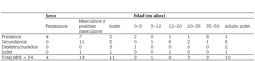 La muestra está compuesta por un número mínimo de individuos (MNI) de 34 provenientes de 13 inhumaciones primarias, seis entierros secundarios (MNI = 16), dos entierros desestructurados (MNI = 3) y dos indeterminados (MNI = 2), pertenecientes a adultos de ambos sexos y subadultos (Tabla 1). Los entierros secundarios están compuestos por cuatro paquetes funerarios, dos acumulaciones óseas y tres cráneos aislados. La determinación del MNI en los entierros secundarios, desestructurados e indeterminados se basó en la unidad anatómica más abundante en cada inhumación (White, 1953).