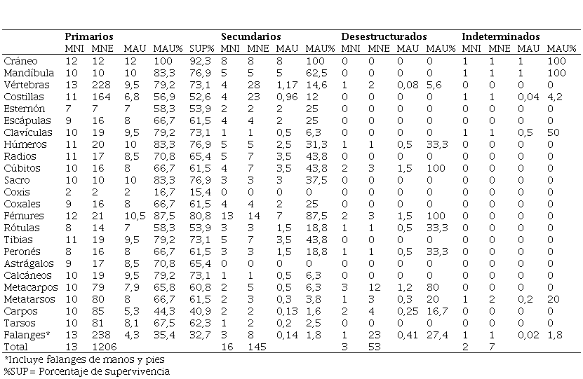 La muestra está conformada por un NISP de 3400 restos óseos humanos y un MNE de 1411. Las inhumaciones primarias tienen una buena representación ósea y estado de preservación. Los índices de supervivencia de cada unidad anatómica oscilan entre el 15,4% para el coxis y el 92,3% para el cráneo (Tabla 2). Los secundarios se componen principalmente de cráneos y huesos largos, mientras que en las inhumaciones desestructuradas predominan los huesos largos; y en las indeterminadas, los elementos craneales. La correlación entre la densidad mineral ósea y los porcentajes de supervivencia de los elementos óseos de los entierros primarios no es estadísticamente significativa (rs = 0,29; p = 0,287).