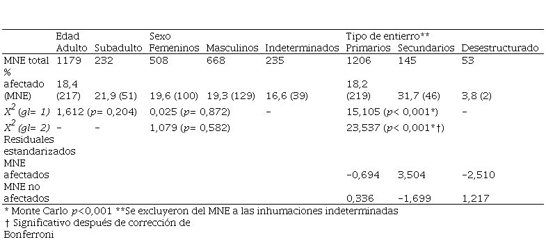 Se evaluó la presencia de diferencias estadísticamente significativas en la cantidad de elementos anatómicos con marcas de insectos entre adultos y subadultos, femeninos y masculinos, y tipos de entierro a través de un análisis de chi-cuadrado (o del test exacto de Fisher cuando las frecuencias esperadas fueran menores a 5). Para los resultados significativos se calcularon los residuales estandarizados para cada nivel del factor comparado. Esta medida permite determinar el nivel del factor que más se aleja del valor esperado bajo la hipótesis nula de no asociación. Todos los análisis estadísticos se hicieron con el programa IBM SPSS Statistics v. 26., con un α = 0,05.