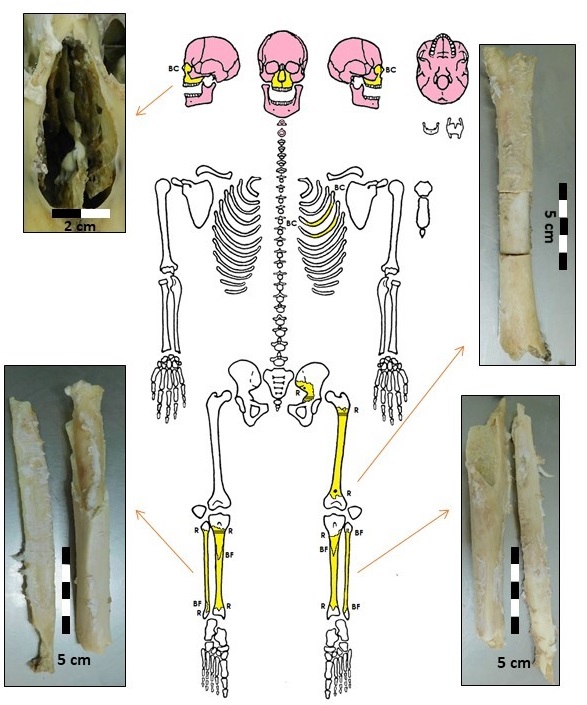 Se recuperaron un total de 18 elementos óseos, correspondientes a: cráneo completo, mandíbula, dos primeras vértebras cervicales, dos fragmentos de costilla izquierda, diáfisis de fémur izquierdo, fragmento de hemipelvis izquierda, ambas tibias, ambos peronés (porciones diafisiarias de distintos elementos) y seis fragmentos no identificados de huesos largos, lo que representa el 22% del esqueleto (Figura 3). Todos los restos óseos presentaban tejidos blandos adheridos y grasa; el cráneo, la mandíbula y las dos primeras vértebras cervicales estaban articulados y unidos por ligamentos y tejidos blandos. El cráneo aún contenía el cerebro en estado de descomposición. No fue posible estimar un IPM desde la observación médico-legal. Los restos de tejidos blandos del cráneo estaban arrugados y blanquecinos, características compatibles con procesos de maceración por estar sumergidos o semisumergidos (Hamilton y Green, 2017).