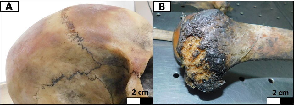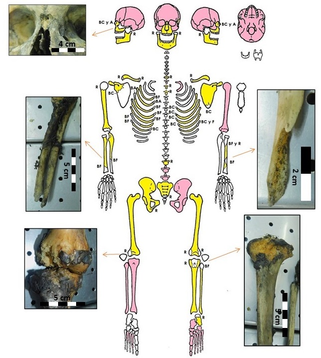 El individuo presentaba señales de termoalteración con distinta coloración en huesos de diferentes unidades anatómicas. El cráneo exhibía, en la región facial y en la mandíbula, una coloración negra. En cambio, el frontal y los parietales tenían áreas marrones y anaranjadas (Figura 5A). Los elementos poscraneales presentaban coloración negra en la mayoría de las superficies corticales, así como también en los tejidos blandos supervivientes. Las marcas de carroñeo afectaban el tejido cortical termoalterado, lo cual indica que la acción de carroñeo fue posterior al evento de termoalteración (Figura 5B).