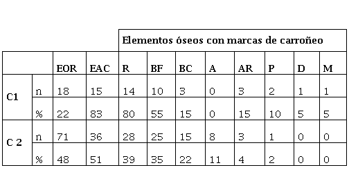 En cuanto a la representación esqueletal del 22% en el C1 y del 48% en el C2, con grados 4 y 2 correspondientes a la secuencia de desarticulación por carroñeo de Haglund (1997) y Haglund et al. (1989). Asimismo, los restos humanos mostraron un patrón de supervivencia de elementos y marcas de carroñeo similares a los registrados en casos anteriores (Mansegosa et al., 2020) y a los establecidos por Haglund et al. (1989) y Haglund (1997) para cánidos. Los cráneos resultaron afectados únicamente en el sector del nasal; las costillas y vértebras se encontraban muy alteradas; los huesos de manos y pies estaban prácticamente ausentes (excepto el C2, que estaba muy bien protegido con calzado); los coxales presentaban la sínfisis púbica casi totalmente ausente; y los elementos de los antebrazos estaban fracturados, así como también los extremos de las epífisis de los huesos largos de las piernas.