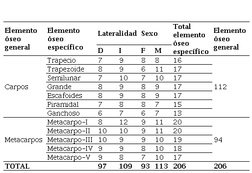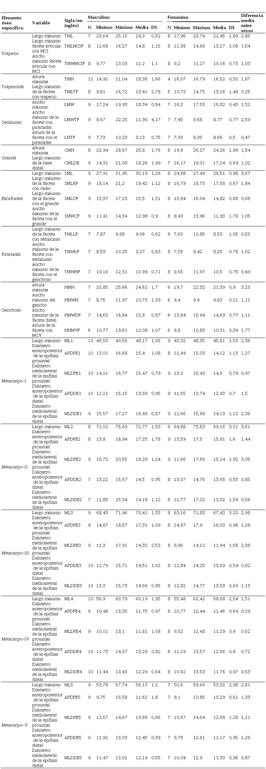 Para las mediciones de los carpos se implementaron los criterios delineados por Sulzmann et al. (2008), y para los metacarpos, los de Scheuer y Elkington (1993). En ambos casos, se seleccionaron las medidas identificadas como más dimórficas y replicables en estos estudios. Esto implicó la toma de 21 dimensiones para cada lateralidad en el caso de los carpos y de 25 medidas para cada lado en los cinco metacarpos. Las medidas específicas efectuadas y su abreviación se presentan en las primeras columnas de la Tabla 2.