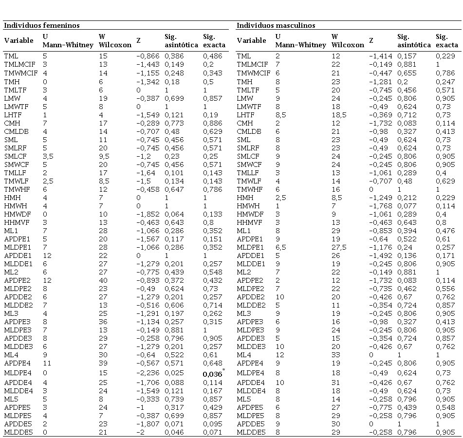 El Test de U-Mann Whitney para evaluar la existencia de asimetría bilateral arrojó valores mayores a 0,05 para todas las medidas con excepción del diámetro mediolateral de la epífisis proximal del metacarpo IV (MLDPE4) entre los individuos femeninos. Esto indica que no existen diferencias estadísticamente significativas entre las medidas en relación con la lateralidad (Tabla 3), por lo que en los análisis posteriores no se distinguieron según este factor (pooled data). En cuanto a la evaluación del dimorfismo sexual a través del test de U-Mann Whitney, la mayoría de las medidas (39/46) arrojaron valores de . menores a 0,05, lo cual confirmaría la existencia de dimorfismo sexual en los carpos y metacarpos de los individuos que integran la colección (Tabla 4). Tales resultados son consistentes con los obtenidos a partir del estadístico de Monte Carlo. Las medidas del TMLTF, LHTF y APDPE4 arrojaron valores muy superiores al nivel de significancia, por lo que, siguiendo la metodología propuesta por Watson (2016), fueron descartadas. Las variables largo máximo del escafoides (SML), largo máximo de la faceta con radio (SMLRF), largo máximo del trapecio (TML) y diámetro mediolateral de la epífisis distal del metacarpo I (MLDDE1) arrojaron valores de significancia de p <0,000 (Tabla 4).
