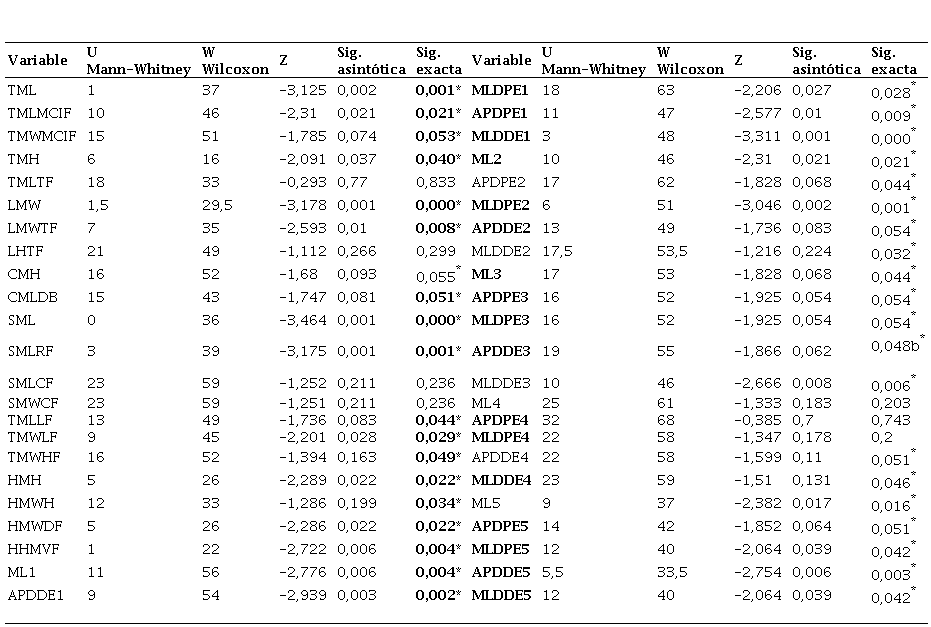Se evaluó el nivel de concordancia entre las dos series de observaciones a partir del coeficiente de correlación intraclase (CCI) para cada una de las medidas analizadas. La mayoría de ellas (41/46) arrojaron valores mayores a 0,75, es decir, un acuerdo excelente según la escala de interpretación de Prieto et al. (1998) (Ver Material suplementario 1). Por tal motivo, se consideró que los valores obtenidos en las dos series de observaciones son válidos y confiables para el estudio, y se empleó la segunda serie de mediciones para los análisis subsecuentes, ya que se considera que la segunda observación refleja mayor experiencia del operador.