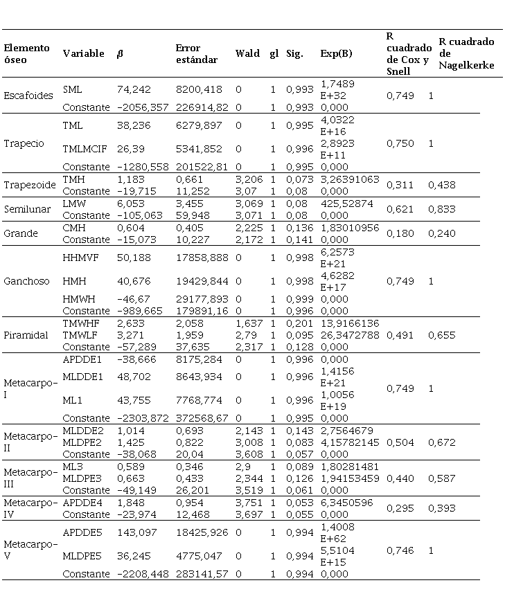 El modelo resultante de la regresión logística binaria brindó las variables en ecuación para cada elemento óseo, es decir, aquellas más acordes para evaluar el sexo de los individuos. La Tabla 5 detalla las 21 variables (11 para los carpos y 10 para los metacarpos) que no fueron eliminadas por el modelo. Los valores de chi-cuadrado obtenidos en la prueba de ómnibus de coeficiente de modelo resultaron estadísticamente significativos (p<0,05) en cada uno de los pasos. Esto sugiere que el modelo resultante predice el sexo de los individuos, ya que las variables seleccionadas son adecuadas para explicar la variable dependiente.