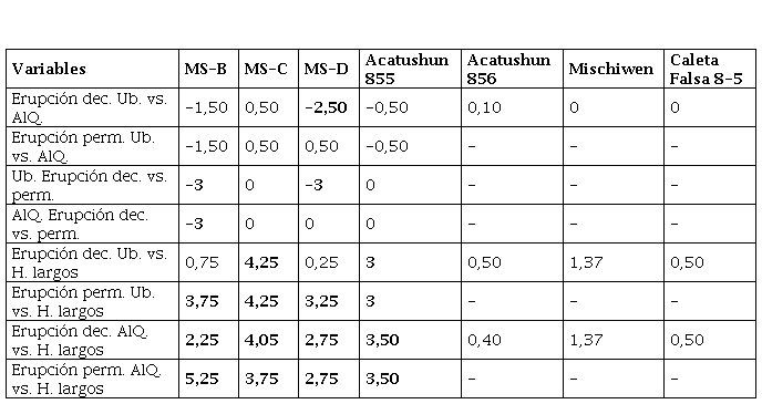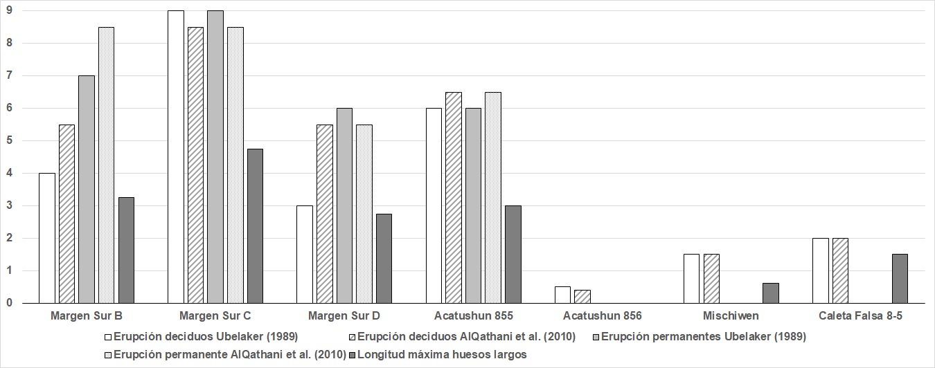 Al cotejar las diferencias relativas en las edades de muerte entre pares de estimaciones, se observan importantes discrepancias en algunos individuos, específicamente entre los mayores a tres años (Margen Sur B, C y D, Acatushun 855; Tabla 3). Por un lado, cuando se comparan los datos referidos a la erupción de la dentición decidua con los de la permanente, se identifican diferencias de tres años para Margen Sur B y D, independientemente del método aplicado. En estos casos, la dentición permanente ofrece estimaciones más altas que la decidua. Por otro lado, en un único individuo (Margen Sur D) se observan importantes diferencias cuando se compara la dentición decidua entre ambos métodos, siendo la propuesta de AlQathani et al., (2010) la que ofrece edades más altas. Finalmente, cuando se comparan los resultados obtenidos a partir de la dentición decidua y permanente con los de la longitud máxima de los huesos largos, se observa que este último siempre ofrece estimaciones de edad menores. Esto es evidente principalmente en los cuatro individuos mencionados, con diferencias de entre 3 y 5,25 años. Nuevamente, las discrepancias entre métodos son bajas entre los individuos menores a tres años.