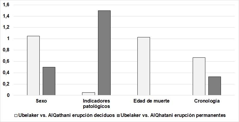 A partir del cálculo del promedio de cada una de las estimaciones obtenidas se evaluaron las diferencias absolutas entre pares de variables y se identificaron discrepancias de baja magnitud (Tabla 4; Figuras 3 y 4). Mientras no se observaron diferencias en relación con el sexo, la comparación en función de la presencia/ausencia de indicadores patológicos indica que solo el método de AlQhatani et al., (2010) para la erupción de ambas denticiones arrojó diferencias de alta magnitud. Un resultado similar fue también registrado con la comparación cronológica para el método de Ubelaker (1989), en ambos tipos de dentición. Finalmente, cuando se consideran ambos grupos de edad (mayores y menores de tres años), se observa que los dos métodos estiman edades mayores para la erupción decidua respecto de la longitud máxima de huesos largos, con valores más altos en los individuos mayores a tres años (Tabla 4; Figuras 3 y 4).