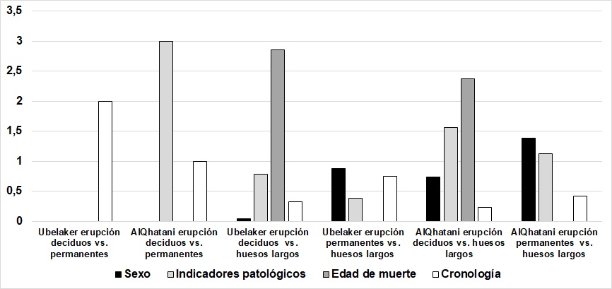 La comparación de diferentes métodos en función de las variables biológicas (sexo, indicadores patológicos, edad de muerte) y la cronología (Tabla 4) no permitió identificar un patrón claro en las diferencias obtenidas en las edades estimadas de cada individuo. Sin embargo, cuando fue considerado el conjunto de la muestra, se observó que los métodos aplicados en este trabajo arrojaron mayores diferencias de edades en individuos de más de tres años. Si bien la muestra analizada está conformada por individuos con cronologías asignables a los últimos 1000 años AP, las diferencias en las edades de muerte de individuos mayores a tres años fueron observadas en esqueletos tanto de momentos precontacto como poscontacto, por lo que se considera que esta no sería una variable explicativa de las diferencias detectadas. Además, se identificaron diferencias apreciables en las edades estimadas para ambos sexos, lo que indicaría que esa variable tampoco influyó en las tendencias inferidas.