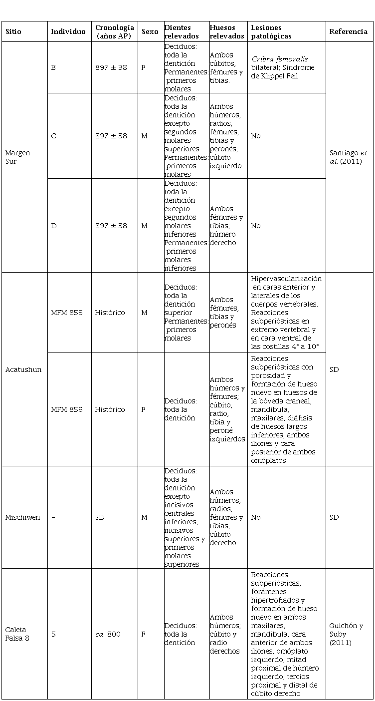 Se analizaron restos humanos pertenecientes a siete individuos no adultos en guarda actualmente en el Museo del Fin del Mundo (Ushuaia, Argentina) y en el Centro Austral de Investigaciones Científicas (CADIC-CONICET, Ushuaia, Argentina), recuperados de cuatro sitios arqueológicos: Margen Sur (norte de Tierra del Fuego), Acatushun, Mischiwen y Caleta Falsa (sur de Tierra del Fuego) (Figura 1). Cuatro de ellos corresponden a periodos previos al contacto, entre 1000 y 400 años AP, otros dos fueron hallados en sitios ubicados cronológicamente en momentos históricos, y el restante no posee asignación cronológica (Tabla 1). Los siete individuos están representados por diferentes unidades anatómicas de varios sectores del esqueleto (e.g., huesos de la columna vertebral, del cráneo, de la pelvis, dientes deciduos y permanentes, etc.) y presentan buena preservación del tejido óseo y dental. Información detallada de los sitios arqueológicos Margen Sur y Caleta Falsa 8 puede consultarse en las referencias mencionadas en la Tabla 1, mientras que los datos de Acatushun y Mischiwen son inéditos.