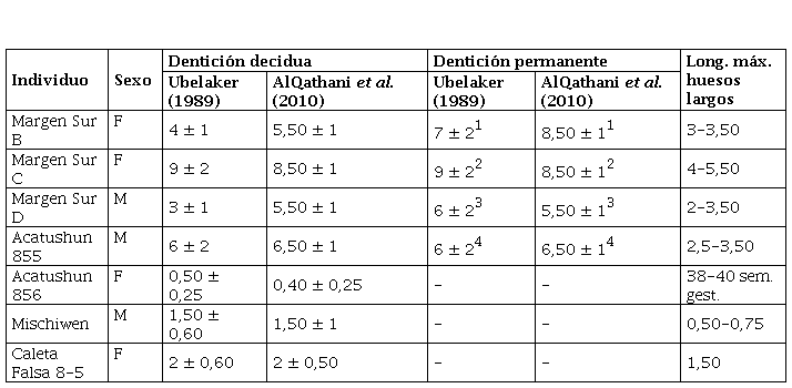 En este trabajo también fue posible observar que, cuando se analizaron individuos con presencia de dentición decidua y permanente, la estimación de la edad fue la más amplia y variable. En este sentido, los dientes permanentes ofrecieron estimaciones de edad mayores que los deciduos. Puesto que estas estimaciones se basaron solo en el registro de los primeros molares permanentes, en comparación con la dentición decidua completa, es posible que el desfasaje sea consecuencia exclusivamente de la información específica de esta única pieza dental.