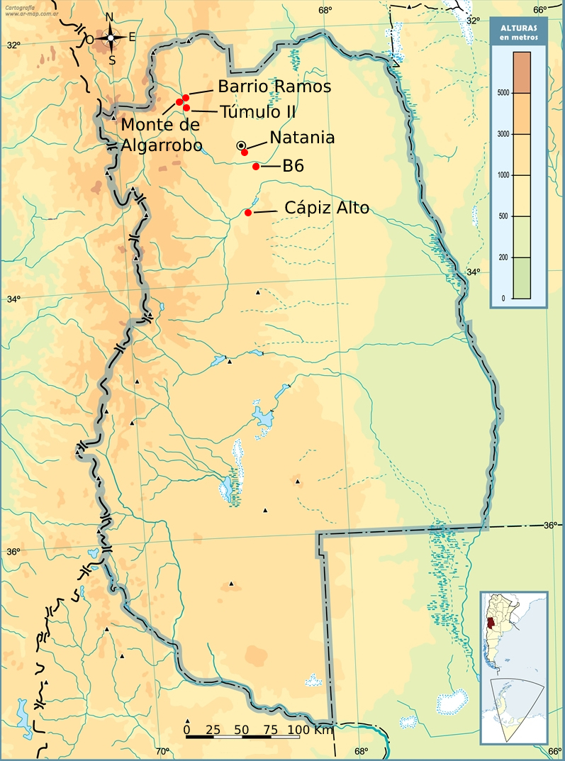 Para este estudio fueron seleccionados restos humanos esqueletales adultos (mayores de 18 a 20 años al momento de la muerte) de ambos sexos del CNM, resguardados en el Museo de Ciencias Naturales y Antropológicas Juan C. Moyano, de la ciudad de Mendoza (Argentina). Para la muestra fueron incluidos aquellos individuos que contaron con más del 90% de los cuerpos vertebrales en condiciones de preservación, que permitieron medir la altura de estos cuerpos en su porción anterior, media y posterior. Se determinó el sexo de los individuos según indicadores pélvicos, craneales y poscraneales (Buikstra y Ubelaker, 1994). Para estimar la edad de muerte se consideraron los cambios morfológicos en el cráneo y la pelvis, tales como los rasgos de la superficie auricular (Lovejoy et al., 1985) y de la sínfisis púbica (Todd, 1921; Brooks y Suchey, 1990). Luego de esta selección, se contó con 27 individuos, con un total de 598 vértebras, pertenecientes a seis sitios arqueológicos: B6, Túmulo II, Natania, Cápiz Alto, Barrio Ramos y Monte de Algarrobos (Figura 1; Tabla 1). Información más detallada acerca de los sitios arqueológicos mencionados puede ser consultada en Novellino et al. (2018). Del total de esqueletos seleccionados, 10 (37%) corresponden a individuos femeninos y 17 (63%) a masculinos. Por otra parte, uno (3,8%) fue estimado como adulto joven, 20 (74%) como adultos medios y seis (22%) como adultos mayores (sensu Buikstra y Ubelaker, 1994).