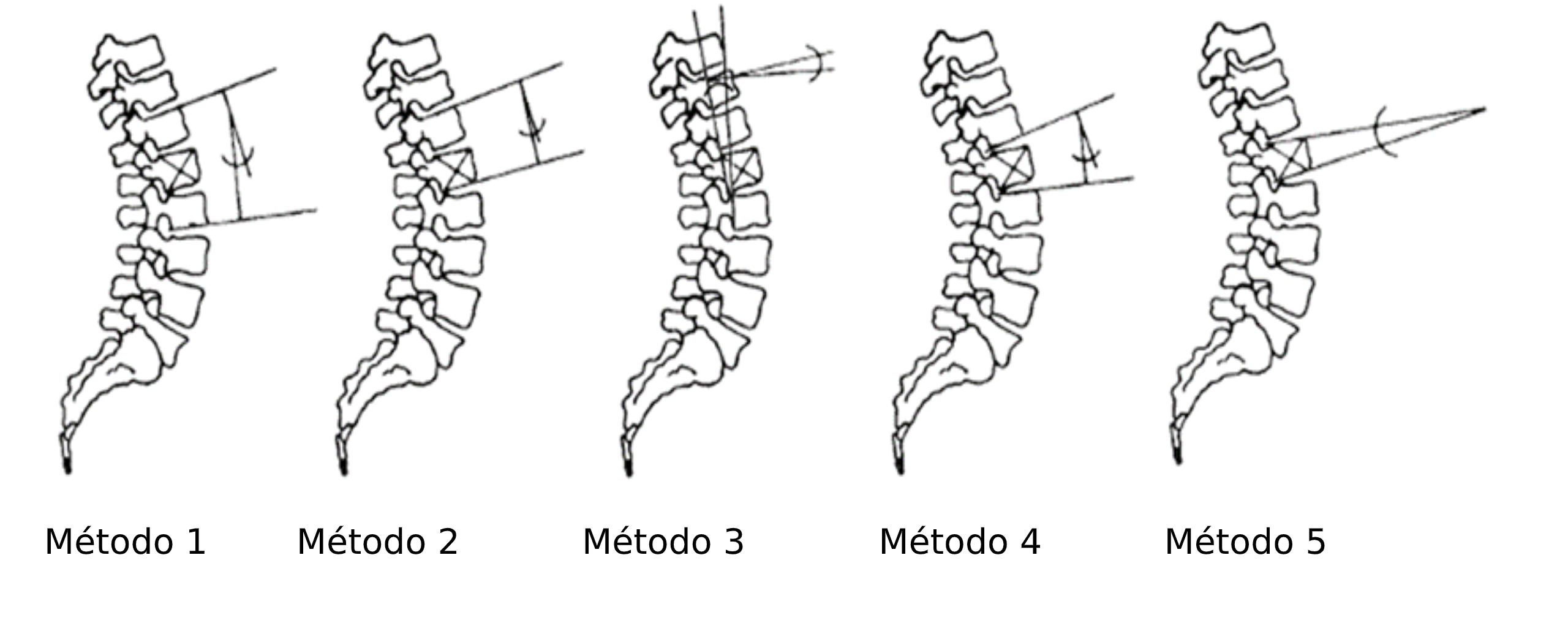 Se han propuesto diversos métodos para medir la compresión vertebral. La mayoría de ellos derivan de su aplicación en estudios clínicos de personas vivas, a través de mediciones realizadas sobre imágenes radiográficas y tomográficas. En un estudio comparativo, Kuklo et al. (2001) evaluaron cuáles de los métodos presentados en la Figura 2 producen los resultados más útiles para el diagnóstico de este tipo de fracturas, entre los que se destaca el método 1, el cual comprende mediciones de la vértebra fracturada y sus vértebras adyacentes, mientras que el método 3 fue el que ofreció resultados menos confiables.