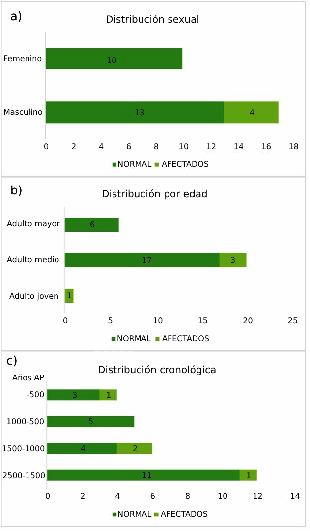 Todos los individuos afectados son masculinos (Figura 5a). El único individuo adulto joven analizado (esqueleto 242 del sitio Túmulo II) presentó dos fracturas de tipo cuña leve en la vértebra D12 y moderada en la vértebra L1. Por otra parte, mientras que tres de los 20 adultos medios presentaron compresiones vertebrales (15%), ninguno de los seis adultos mayores resultó afectado por este tipo de fracturas (Figura 5b).