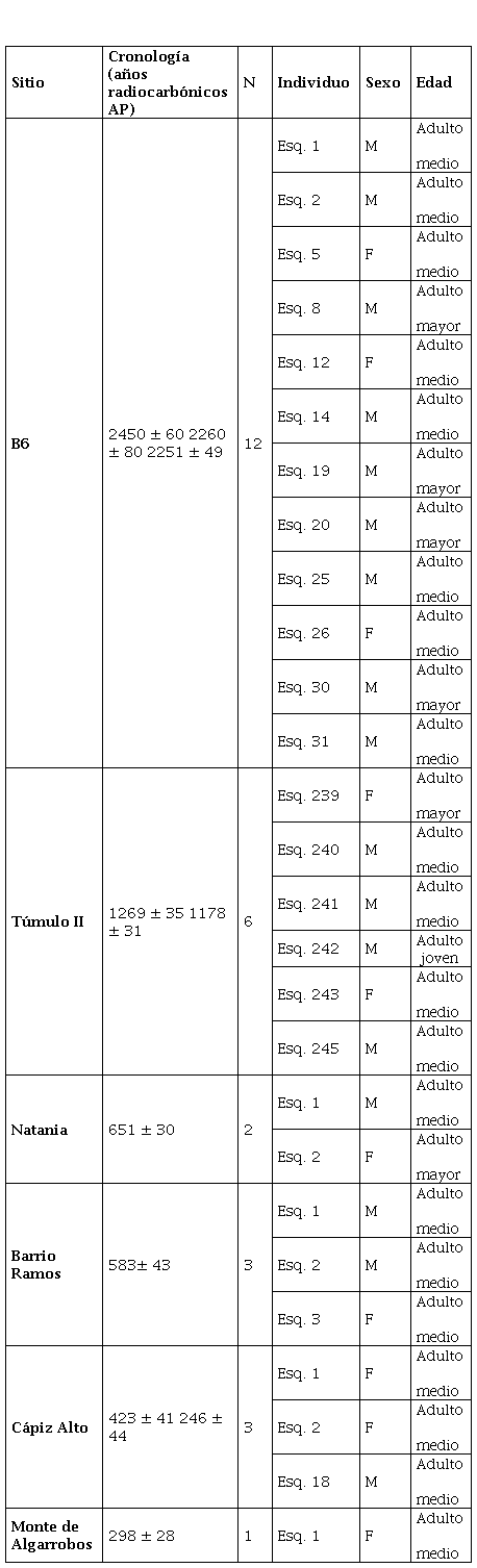 Por el contrario, en los restos asociados a sitios con fechados correspondientes al periodo 1000-500 años AP –concretamente, los sitios Natania y Barrio Ramos– no se encontraron lesiones asociadas a fracturas vertebrales. Los cambios importantes en la demografía, cultura y estrategias de vida asociados a la dominación Inka durante esta etapa supondrían la posibilidad de aumentos en las lesiones traumáticas, hecho que no se observa en los restos analizados, ya sea por un sesgo muestral o bien porque los restos analizados aquí no estuvieron expuestos a condiciones desfavorables que permitieran el desarrollo de fracturas compresivas. Por último, la frecuencia de fracturas vertebrales vuelve a elevarse en los restos analizados que poseen fechados que coinciden con el periodo de la conquista europea, como los sitios Cápiz Alto y Monte de Algarrobos. Sin embargo, las lesiones identificadas en el único esqueleto afectado de este periodo podrían ser secundarias a una patología metabólica aún no diagnosticada, y no a un trauma agudo.
