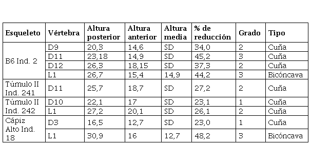 Se detectaron fracturas compresivas en nueve de las 598 vértebras analizadas (1,5%), las cuales afectaron a cuatro de los 27 individuos incluidos en este estudio, lo que resultó en una prevalencia general del 14,8%. En la Tabla 2 se muestran los resultados tomados en las vértebras en las cuales se detectaron reducciones de la altura.