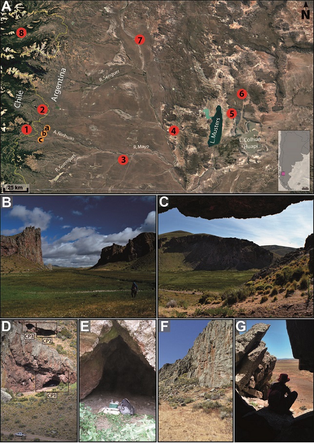 Este sitio está constituido por tres abrigos (1, 2 y 3), todos orientados hacia el NE y protegidos de los vientos del O (Pérez de Micou et al., 2013) (Figura 1 B). CP1 se ubica a 12 metros aproximadamente del actual camino que une las estancias Roselló y El Ñire, y a 100 m de distancia del arroyo Ñirihuao, a una altura de 698 msnm (Pérez de Micou et al., 2013; Castro Esnal et al., 2016; Castro Esnal et al., 2017a). Se accede mediante una ligera pendiente, cubierta por vegetación compuesta por gramíneas y algunos arbustos. Sus dimensiones son aproximadamente 12 m de profundidad × 22 m de ancho máximo. Este sitio presenta relleno sedimentario en un amplio sector, luz natural todo el día y oquedades pequeñas con baja sedimentación y poca luz. Desde el sitio pueden observarse el arroyo y el lado contrario del cañadón (Figura 1 B, C y D).