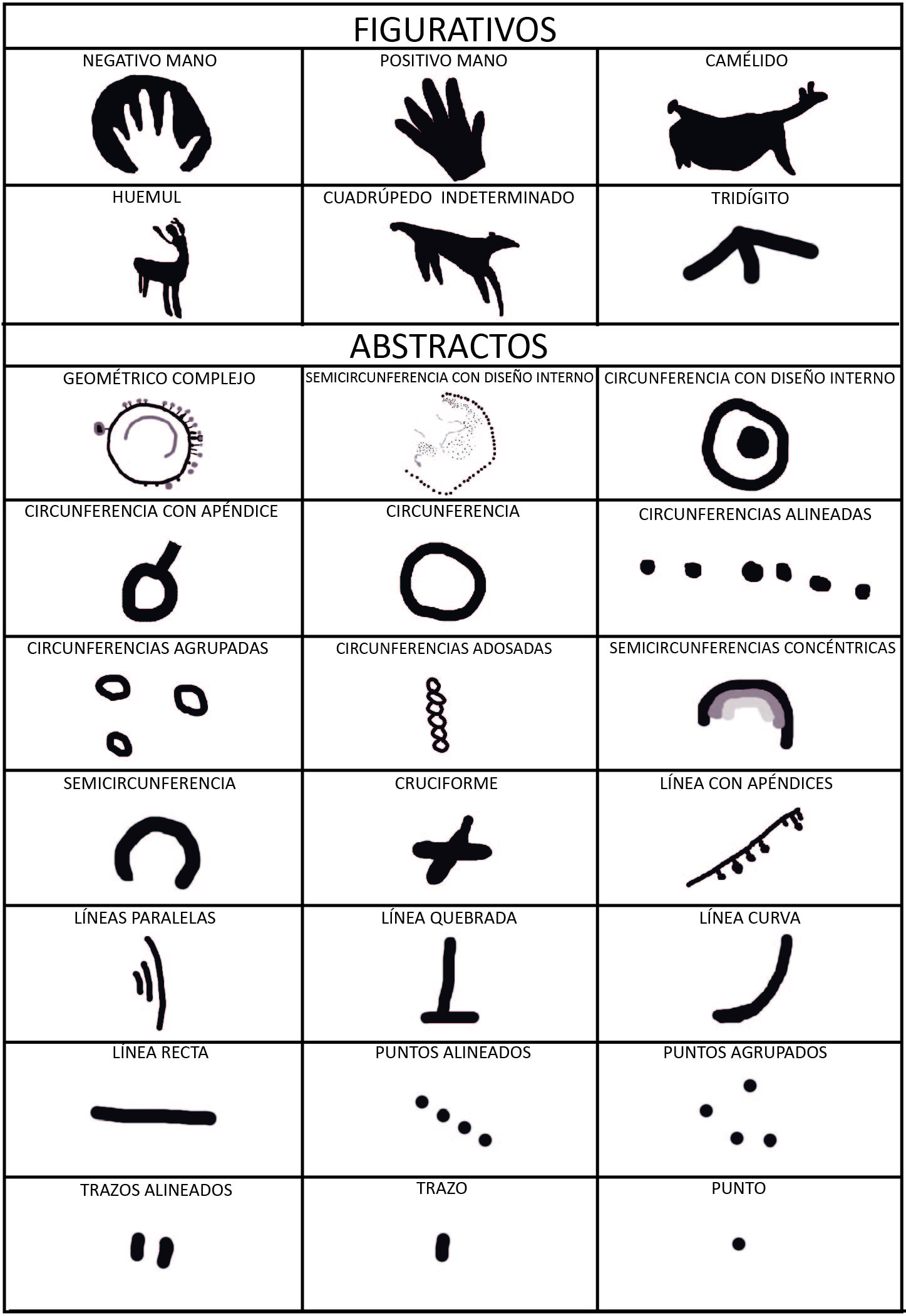 Categorías: los motivos se agruparon en figurativos (aquellos casos en los que se reconoce el referente material y real de lo representado) y abstractos (casos en los que no se reconoce un referente real) (Gradin, 1978b). En aquellos casos en los que no fue posible acceder a su morfología por la mala conservación, se utilizó la categoría “indeterminados por deterioro”.