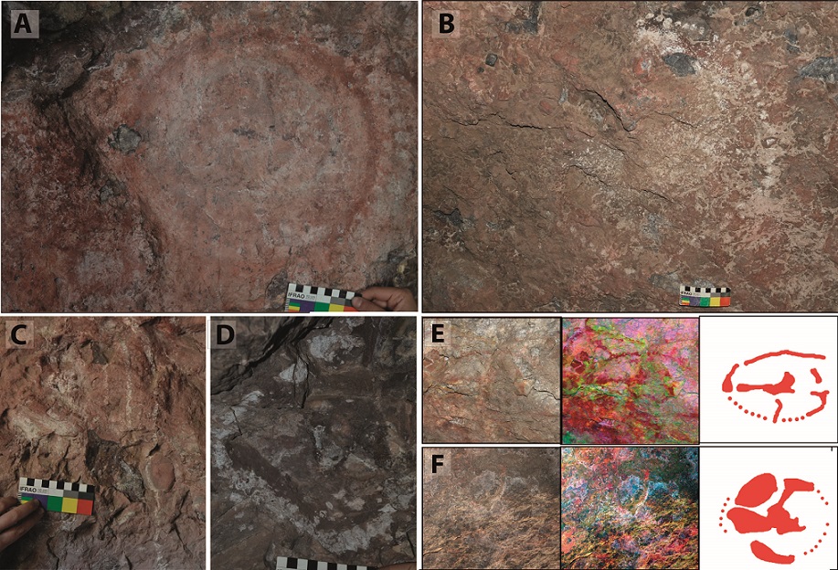 Las representaciones identificadas (n = 152) se distribuyen en cinco paneles, muy alterados por manchas férreas. La mayoría de estos motivos presenta un mal estado de conservación (n = 81), seguidos por otros con un estado regular (n = 57) y bueno (n = 13). Se determinaron 104 abstractos, nueve figurativos y 39 indeterminados por deterioro. Los abstractos constituyen el mayor número de casos y presentan 16 tipos (Tabla 1). La mayoría (n = 97) fueron realizados en color blanco; se destaca el tratamiento lineal para circunferencias y líneas. Estos motivos constituyen las representaciones de mayor tamaño y visibilidad (Figura 5). En cuanto a los figurativos, solo se registraron camélidos en tono rojo (Tabla 1).