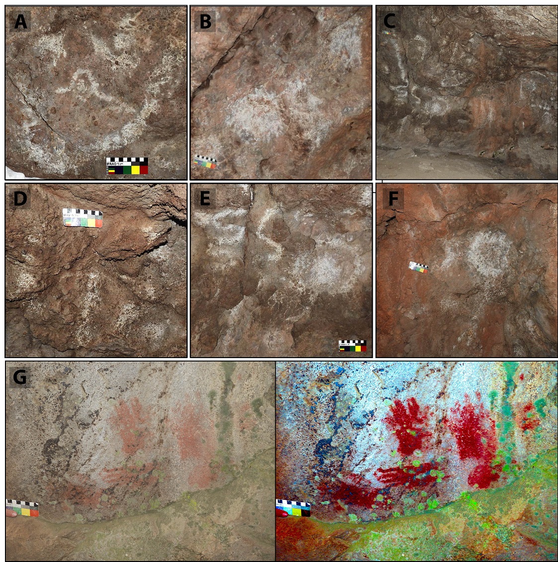 Todas las representaciones son de un tamaño menor a 10 × 10 cm, por lo que fueron caracterizadas como improntas de mano pertenecientes a infantes. Todas fueron realizadas en un mismo tono de rojo (Figura 5G). Se observa una sola superposición.