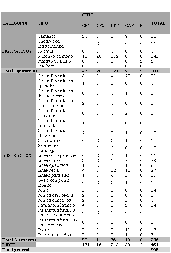 En suma, el 82,29% (n = 739) del total de motivos del área (n = 898) se concentra en CP (Tabla 1). Más específicamente, el 29,17% se encuentra en CP1, el 4,12% en CP2 y el 48,99% en CP3. Además de tener la mayor cantidad de motivos del área, CP presenta la mayor variedad de tipos: de los 26 tipos de motivos registrados en el área de estudio, en CP se encuentran representados 24 (específicamente, CP3 posee 22 de 26 tipos representados, y CP1, 21 de 26) (Tabla 1).