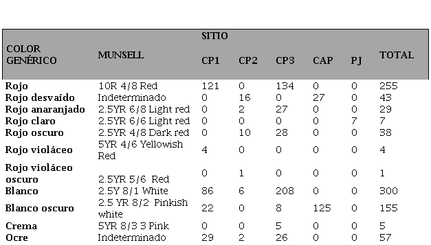 Se registró el uso de seis colores: ocre, rojo anaranjado, rojo oscuro, rojo violáceo, rojo desvaído y blanco (Munsell Soil Color Chart, 1994) (Tabla 2). Se identificaron dos casos de superposiciones que involucran motivos blancos sobre otros de color rojo oscuro.