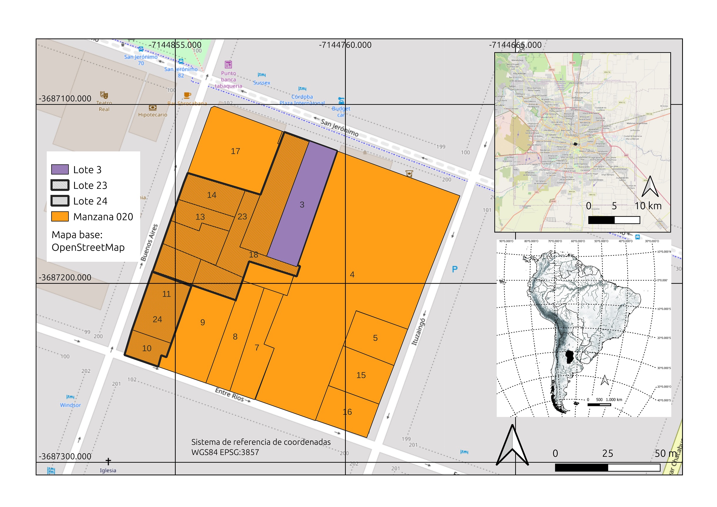 Durante los años 2014, 2015 y 2018 se llevaron adelante tareas de excavación, recuperación y conservación de la cultura material sobre varias parcelas de una de las manzanas del área central de Córdoba, ocupadas actualmente por instalaciones del Banco de la Provincia de Córdoba (nomenclatura catastral 04-04-020, de ahora en adelante Manzana 020) (Izeta y Pautassi, 2014, 2015a, b, c y d; Izeta et al., 2017; Izeta y Cattáneo, 2019). Los estudios fueron solicitados en el marco de normativas vigentes (Ordenanza 11.202/07 y 11.935/11) con permisos de la municipalidad y la provincia de Córdoba, sobre la parcela 23, localizada entre las calles Buenos Aires y San Jerónimo y en la esquina de la plaza San Martín, y sobre la parcela 24, entre las calles Buenos Aires y Entre Ríos (Figura 1).