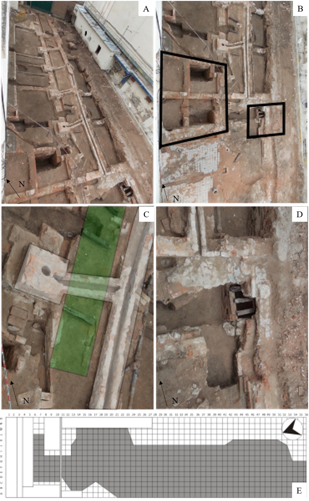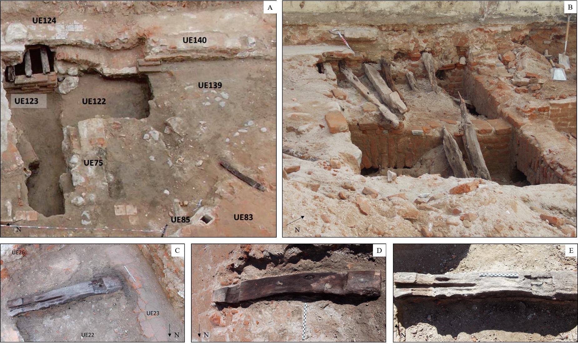 A partir del relevamiento de las estructuras actuales y arqueológicas, Izeta y colaboradores reconocen al menos tres períodos constructivos (Izeta et al., 2017, p. 131). El primero, que podría ser ubicado en algún momento del siglo XVIII y que estaría mayormente representado por los restos de cisternas construidas con ladrillos de grandes dimensiones y que se encuentran por fuera de las normas reglamentadas por el gobernador Marqués de Sobremonte hacia la década de 1780. De acuerdo con esto, se registró la presencia de una estructura caracterizada como cisterna captadora de agua potable (UE117) cuyo soporte de techo estaba asociado a vigas de madera de las especies Vachellia caven . Neltuma chilensis (Figura 3B). Un segundo momento, ubicado hacia el último tercio del siglo XIX, para el que se pudieron contrastar los rasgos arquitectónicos registrados por A. Machado sobre una casa que sigue el modelo de patio alineado. Para esta construcción se recuperaron pequeños durmientes o estructuras de madera que pueden haber sido utilizadas como soporte de un piso entablonado o quizás hasta vanos y dinteles. La interpretación no es clara, pero los elementos se encontraban in situ respetando sugerentemente una distancia regular entre sí. Se destaca el uso de Schinopsis balansae en los tres casos identificados in situ (Figura 3C, D y E).