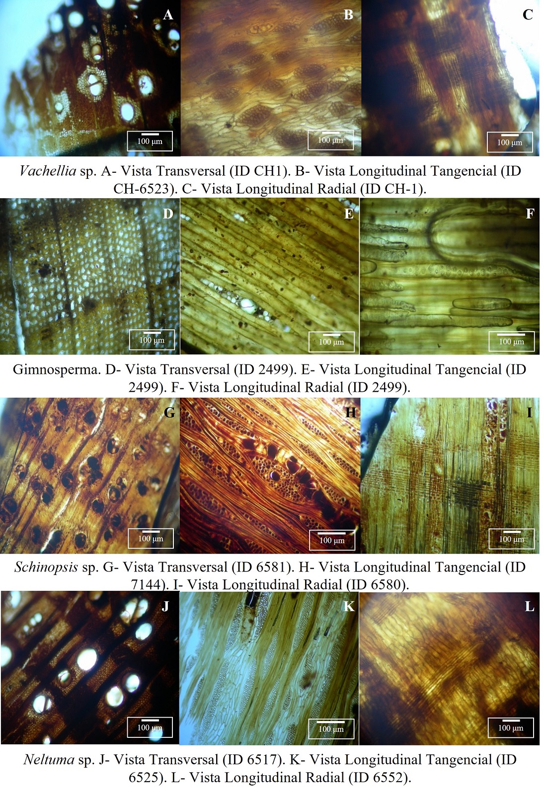 ▪ Schinopsis balansae: leño de anillos no demarcados, porosidad difusa; disposición de vasos en múltiples radiales de dos a cinco elementos; vasos solitarios de contorno elíptico; elementos vasculares de trayecto rectilíneo; parénquima apotraqueal y paratraqueal vasicéntrico escaso. Radios multiseriados de uno a tres elementos. Células radiales procumbentes y verticales, característica que le permite diferenciarse de Schinopsis hankeana (células solo procumbentes), el otro taxón frecuente en el Bosque Chaqueño Serrano (Robledo, 2016, p. 172). Además, otra característica propia de la especie balansae es el canal secretor de tanino (Giménez et al., 2015) que pudo ser detectado en la Figura 4H. En este trabajo, solo dos ejemplares no pudieron ser determinados como balansae dado que en el plano longitudinal no fue posible distinguir con claridad la presencia de células radiales procumbentes más las cuadradas.