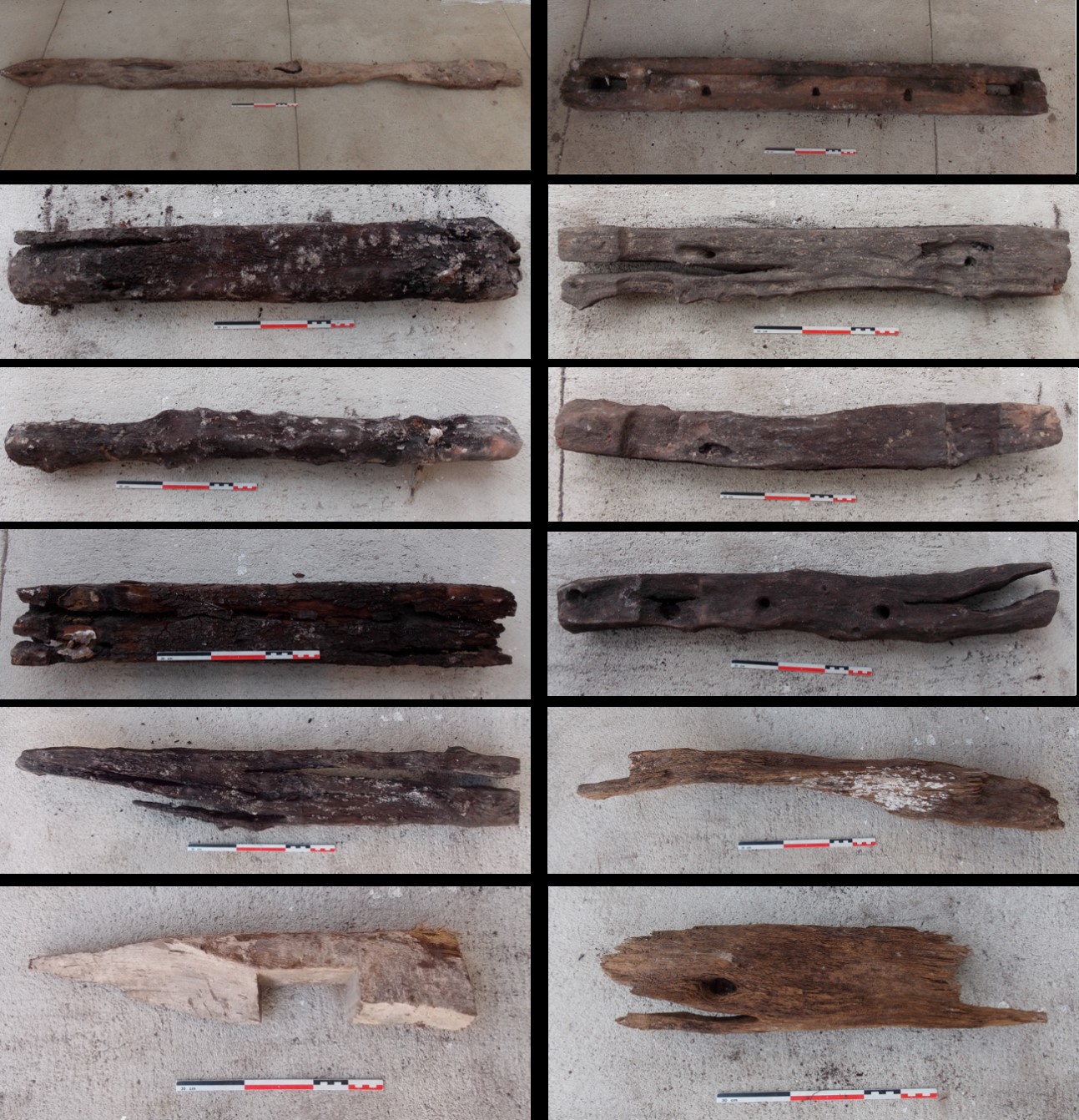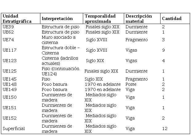 Finalmente, se destaca que muchas de las intervenciones posteriores generaron el rellenado de los distintos espacios y construcciones subterráneas con materiales más modernos (ca. 1970) como la UE148 y UE149, donde se descartaron restos de postes y vigas de Schinopsis; como así también, el material recuperado por la acción de la retroexcavadora donde se recuperaron 16 fragmentos de vigas de distintas dimensiones (Figura 5), con la presencia de las especies Schinopsis balansae, Vachellia caven y el fragmento de madera de Gimnospermas.