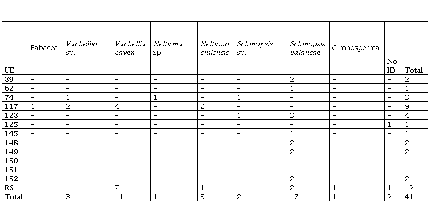 El análisis taxonómico llevado a cabo sobre las 41 muestras histológicas estudiadas refiere a la presencia de tres géneros pertenecientes al Bosque Chaqueño Serrano (Cabrera, 1976) y uno del grupo de las Gimnospermas que no correspondería a la vegetación nativa local (Tabla 2). Se pudo identificar la mayor parte de la muestra, salvo en dos casos, donde los cortes histológicos no fueron lo suficientemente delgados como para permitir la observación bajo microscopio y poder describir las características anatómicas.