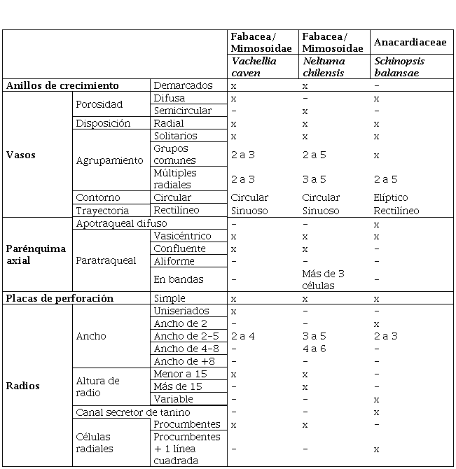 Además, en 31 de estas muestras se pudo arribar a la identificación a nivel de especie: Vachellia caven (Molina) Seiger & Ebinger (espinillo), Neltuma chilensis (Molina) C. E. Huges & G.P. Lewis (algarrobo blanco) y Schinopsis balansae Engl. (quebracho colorado). Es preciso aclarar que las identificaciones a nivel de especie para algunos géneros del Bosque Chaqueño Serrano suelen ser dificultosas, dado, entre otras cosas, el estado de conservación de la muestra junto con las posibilidades de describir todos los caracteres diagnósticos necesarios y la variabilidad taxonómica entre especies, que, aún con avances, es una discusión abierta (e.g., Castro 1994; Marconetto, 2008; Robledo, 2021; entre otros). No obstante, la consulta de trabajos anatómicos especializados en los mencionados géneros (Moglia y Giménez, 1998; Bravo et al., 2006; Bolzón de Muñiz et al., 2010; Giménez et al., 2015; Mafferra et al., 2015, entre otros), así como también contar con la colección de referencia para maderas leñosas procedentes de la región de estudio (Robledo, 2016) localizada en el IDACOR-CONICET, permitieron afinar la identificación a nivel de especie a partir de características que mencionaremos a continuación: